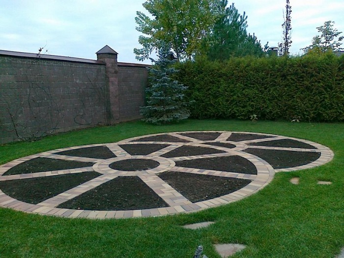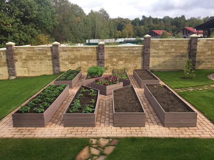 Материал грядок подбирается под общий стиль сада. Это может быть дерево,