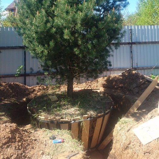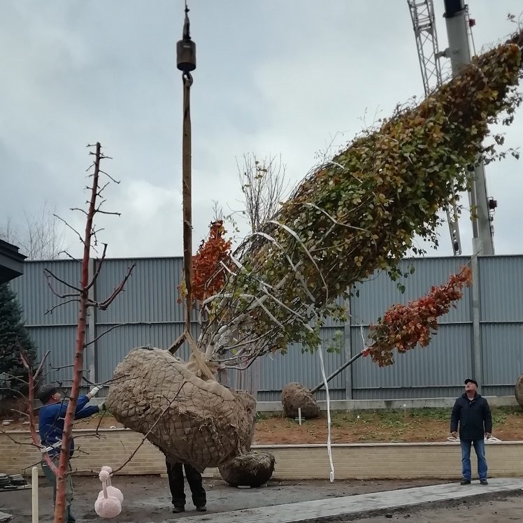 После отбора растений, их начинают выкапывать в питомниках. Даже при современной усовершенствованной технике выкопки растений, дальнейшая посадка крупномеров на новом месте требует больших усилий и знаний. На первом этапе нужно вовремя и правильно выкопать посадочные ямы достаточного диаметра и глубины. Лучше заранее определить места посадок и откопать почву до ее замерзания. Важно учитывать залегание коммуникаций, будущие или существующие дорожки, газоны и цветники. Иначе восстановление поврежденных участков может вылиться в приличную сумму. Затем деревья транспортируют и доставляют на участок. Важно внимательно принимать растения и смотреть нет ли повреждений, а далее следить за процессом выгрузки и посадки крупномера краном.